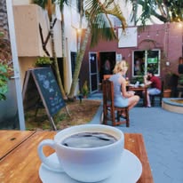 Un café delicioso, preparado por alguien que sabe cómo prepararlo. La temperatura es perfecta, y el latte no viene preendulzado, como descubrí que es lo habitual aquí. El ambiente es agradable. ¡El lugar perfecto para tomar un café después de un paseo por la playa al amanecer!
